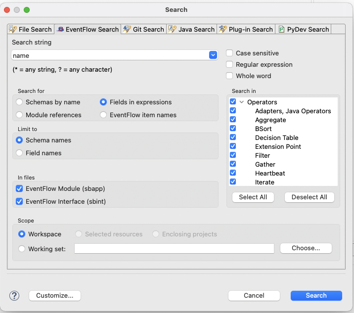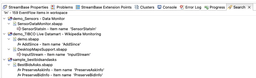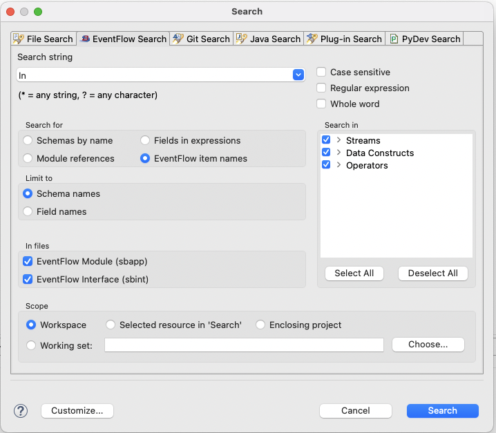 EventFlow Search is part of Text Search in Studio and works similar to File Search or Java Search. You can search for any string in the workspace with the help of EventFlow Search. To open the EventFlow Search window in the current Studio workspace, use one of the following methods: