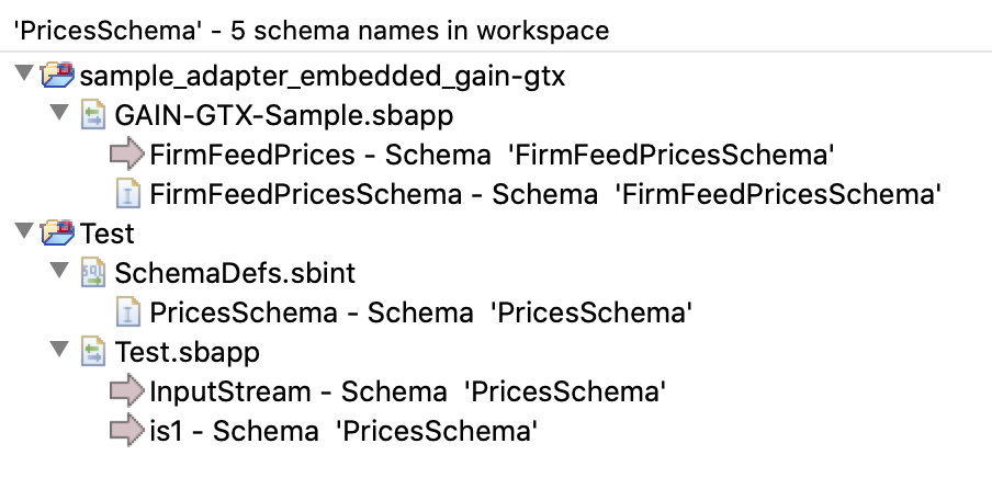 (double), and quantity (int). PricesSchema is defined in a file SchemaDefs.sbint, and used in module Test.sbapp inside an input stream named in. If you search for PricesSchema, results will show schema definition in