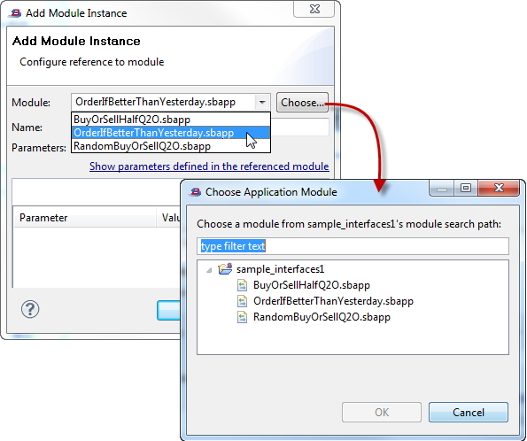 Use the button to open the Add Module Instance dialog. Select a module name from the Module drop-down list or click Choose to open the Choose Application Module dialog. The list of modules in both the dropdown and the Choose dialog is restricted to modules on the current project's module search path. Specify an identifier for the module you are adding.
