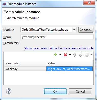 Select a module instance in the grid and click . This opens the Edit Module Instance dialog, which is used just like the Add dialog described above.