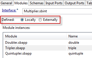 Select Defined: Locally, the default setting, to use the Module instances grid to enumerate the modules that implement this operator's interface.