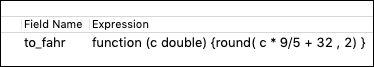 The function body contains a valid StreamBase expression, such as the following, which accepts a double value, the temperature in Celsius degrees, and returns the same temperature on the Fahrenheit scale: