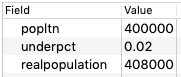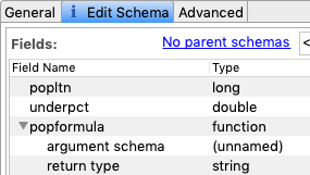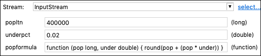 population, anundercountpercentage, and the entire function literal for a function that takes the data types defined in the Input Stream's schema, a long and a double:function (pop long, under double) {round(pop + (pop * under))}