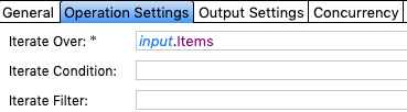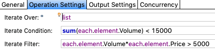 The Iterate operator creates a tuple named each that is available for use in expressions in the Iterate Condition and Iterate Filter properties of the Operator Settings tab, as well as in any expression in the Output Settings tab.