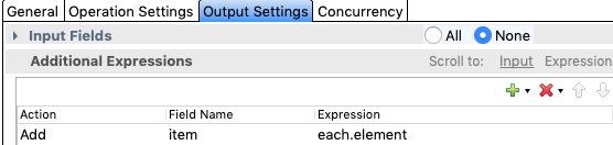 You can specify or define fields to be emitted from the operator using the field grid on the Output Settings tab, much like in the Map operator.