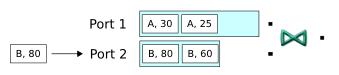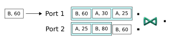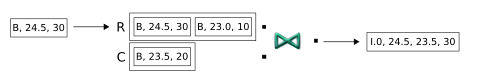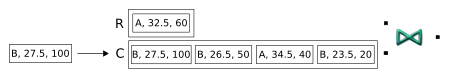 Next, a tuple enters the second input port, and it matches a tuple in the first buffer. Therefore a Join occurs, and the operator releases a matching tuple. In addition, notice that when the window is full and a new tuple arrives, the window advances over the stream of tuples: the oldest tuple in the window (B, 60), is flushed from the window.