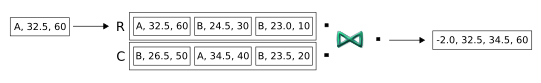 The last tuple, enqueued on the C input port, matches two tuples on the R port. However, the new tuple causes the range of time values in the matching tuples to exceed the specified join range of 60 seconds. The new tuple advances the high end of the range to 100, and the other matching tuples are now below the join range. As a result, the matching tuples on the other port are purged from the buffer, and no output is emitted: