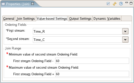 The Value-based Settings tab is available only when you select Join by values on the Join Settings tab. Use this tab to choose the fields you want to order on, and a range of values beyond which the two fields cannot differ: