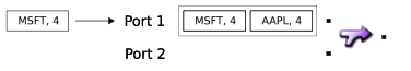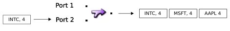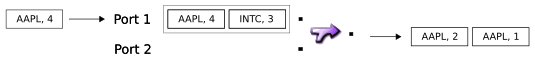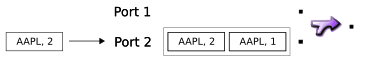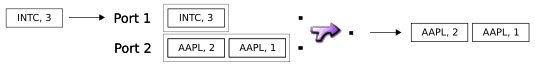 When the next tuple arrives on the first stream, the same condition applies as in Example 1: the two tuples on the second port have earlier timestamps. However, no merge occurs this time, because now we want to group tuples by symbol. None of the tuples buffered on the second port matches the symbol of the incoming tuple, so the new tuple is buffered while the Merge operator waits for more input.