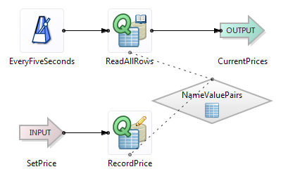 In effect, the Read operation of the connected ReadAllRows Query operator occurs at that interval. The Read operation is a lookup of the current share Price from the NameValuePairs Query Table.