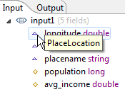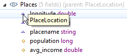 In most schema displays, locally defined fields are marked with a gold diamond as shown in the images above. This applies to schemas shown in the EventFlow Editor's Definitions tab, in the Interface tab of the Interface Editor, and in the Streams tab of the Properties view.
