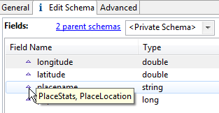If two parent schemas have same-named fields with the same data type, that field is added once to the current schema, and its hover text shows both parent schemas.