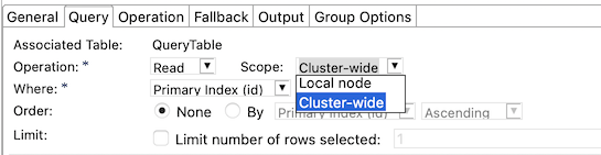 | Read | Local node scope performs the query on the local node only. The rows must exist (either primary, replica, or cached copies) on the local node to be returned by the query. Cluster-wide scope performs the query on all nodes in the cluster. |