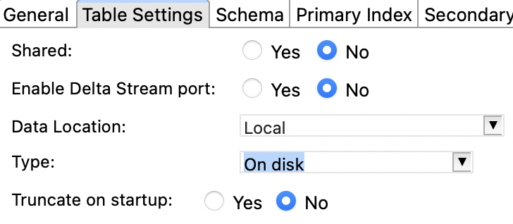 | Fields | Inherited or empty | Unless you have specified a for this table, the Fields drop-down is dimmed, and the fields of the schema grid are populated by the table schema and are non-editable. When enabled, the Fields drop-down lets you choose from available named schemas. To configure a local schema, set the Fields drop-down to . Enter a private schema for this table and then define indexes for it, as described below. |