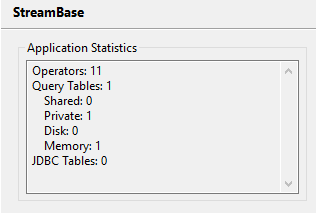 The StreamBase panel of the file Properties dialog only appears when the selected file is an EventFlow module file. The panel has one section, Application Statistics, which shows the following information about the currently selected EventFlow module, including all of its referenced submodules: