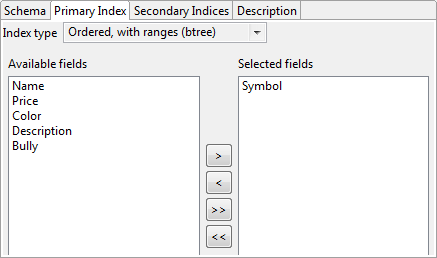 Use the Primary Index tab to specify one or more fields to serve as the primary lookup field for Query Tables that use this table schema. See the Primary Index tab for the Query Table data construct for further details on defining a primary index.