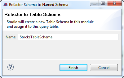 In the Refactor to Table Schema dialog, Studio suggests a named for the new table schema based on the Query Table's name with "Schema" appended.