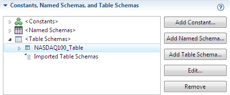 Define table schemas in the Definitions tab of an EventFlow Editor. Manage table schemas in the Constants, Named Schemas, and Table Schemas section of the tab as follows: