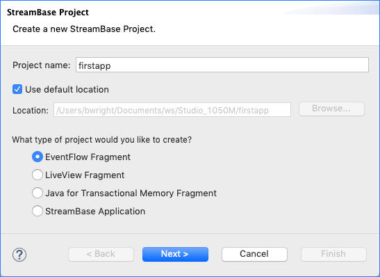 This topic shows the steps to create a Studio project to contain StreamBase fragment development of a simple EventFlow module.