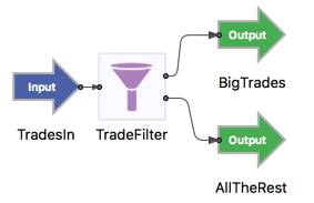1. Drag an Output Stream icon from the Palette view into the canvas, and drop it on the right of the Filter operator. Rename this stream BigTrades.