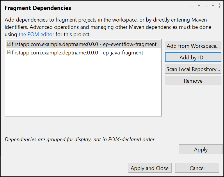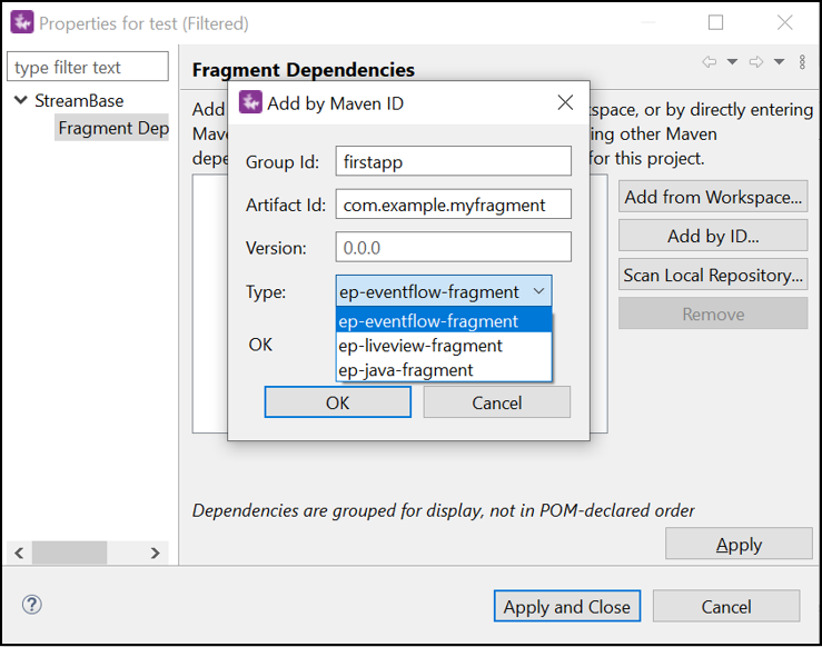 Click Add by ID... to enter Maven coordinates (groupId, artifactId, version, and type) of the fragment dependency you would like to add. For example, enter the Group ID of the