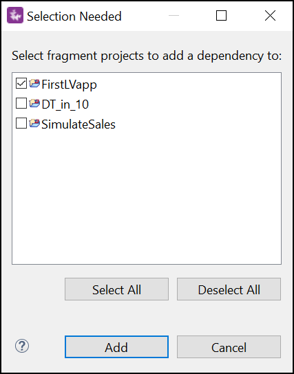 Click Add from Workspace... to add dependencies to fragment projects in the workspace. Select a fragment project in the workspace and select Add to add it as a dependency.