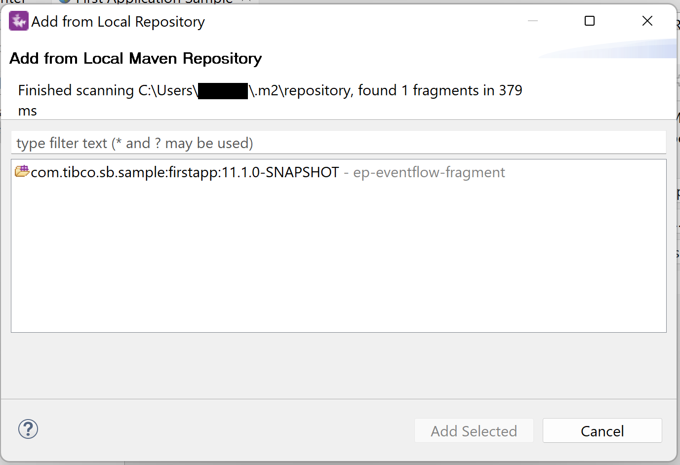 Click Scan Local Repository... to scan the local Maven repository. Select a dependency that you would like to add from the scan list.