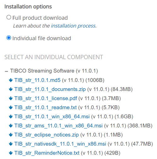 On the TIBCO eDelivery download page for the desired Spotfire Streaming software release, select the Individual file download method.