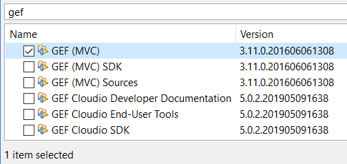 The Eclipse base kit you start with, if other than the recommended Eclipse for RCP and RAP Developers kit, may already include the Eclipse Modeling Framework. Confirm its presence by opening >>. Select the Plug-ins tab, and look for EMF Xcore in the Plug-in Name column. If EMF is already installed, skip now to install the Graphical Editing Framework.