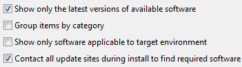 When installing the Studio plug-ins into Eclipse, it is the best practice to do so while your machine has open access to the Internet, and with the Contact all update sites check box selected on the Available Software Install dialog.
