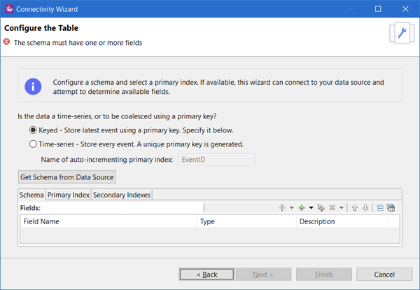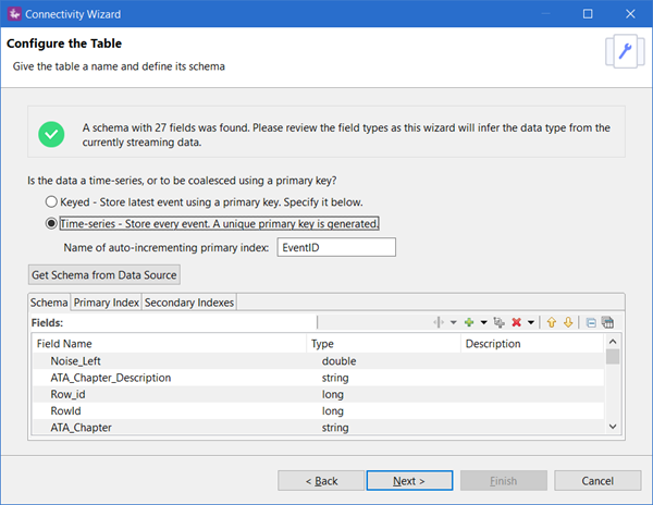 Configure the data table. Use a field as a primary key, or let the Connectivity Wizard do it for you. The advantage of the latter: data can be replayed repeatedly, each time generating a new key. If you do not set a primary key, any replay of the data would be considered an update (as opposed to a new row). This in effect looks like the simulated stream appears to stop. This tutorial selected . From the returned schema definition, you can select a primary key.