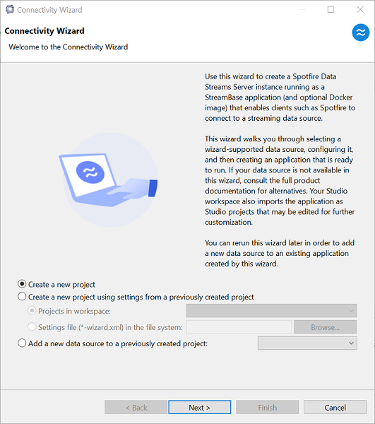 Invoke the Connectivity Wizard from the Authoring perspective in StreamBase Studio with >. Use the wizard to quickly stand up a LiveView server application for the purpose of streaming live data to Spotfire from certain known, working data sources. These are: