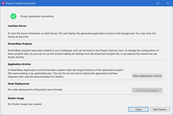 targetfolder, whose file name ends in-ep-application.zip. This application archive can be deployed into a StreamBase Runtime node.If you specified the Docker option, the application image is installed in your local Docker registry under the name
