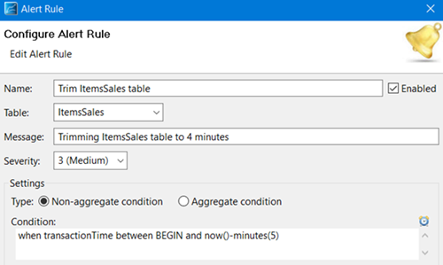 The Hello LiveView sample application contains a Delete Rows Alert Rule called Trim ItemsSales Table that deletes all ItemsSales table rows that are more than four minutes old, every five minutes. The run period is slightly longer than the trim period to give the delete rows action time to run on a very large table before the next alert would run.