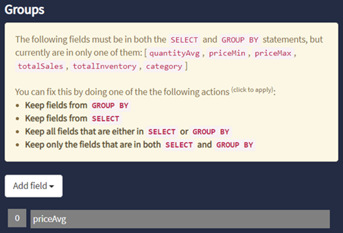 To add a GROUP BY expression, under select a field from the drop-down list. LiveView Web displays additional information based on your selection.
