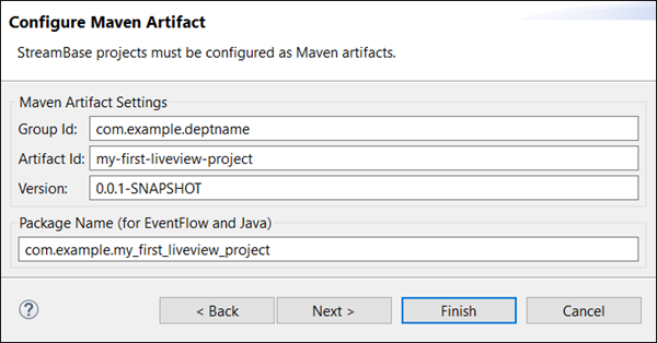 com.example.deptnamein the Group Id field. (If your site already has a standard Group ID for Maven projects, you can use that name instead.)Notice that the Package Name field is automatically generated by combining the Group ID and the Artifact ID, which is the same as the Project Name you specified in step 3. Hyphens in the Artifact ID are changed to underlines, according to Java and Maven package name standards. Do not change the Package Name.