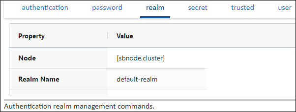 Selecting a security managed entity shows the following tabs in the right pane for the default authentication realm.