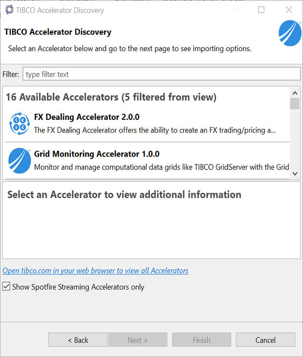TIBCO Accelerator Discovery allows you to browse available Accelerators from TIBCO Community. Using the wizard, you can view information about all Accelerators, download them to your computer, and import them into your Studio workspace. This plugin works with any Eclipse-based product, but only shows Accelerators that require the current product by default. This can be toggled in the wizard to show all Accelerators.