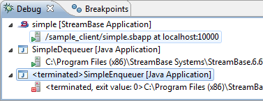 SimpleDequeuerlauncher. This runs the Java program of that name, which connects to the StreamBase Server instance runningSimpleServer.sbapp. The Console view reports:SimpleDequeuer: Ready