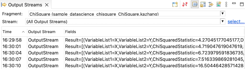 The Chi-square operater starts streaming randomly generated data which has X, Y, and Z column. It will test the independence between X, Y, and Z variables and send results downstream.