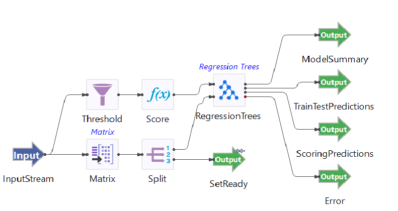 The provided StreamBase module uses the Boston Housing 2 data - BostonHousing2.csv. ValueofOccupiedHomes is selected as the response. The rest of the fields are selected as predictors. Data is fed into the Matrix operator to be collected and emitted every 500 rows. Once the matrix operator has collected the required number of rows of data, the SetReady output stream sets a dynamic variable indicating the Threshold condition has been met. The first N tuples are not scored because the operator is yet to be trained. This operator uses the collected data and options (from the provided schema) as inputs.