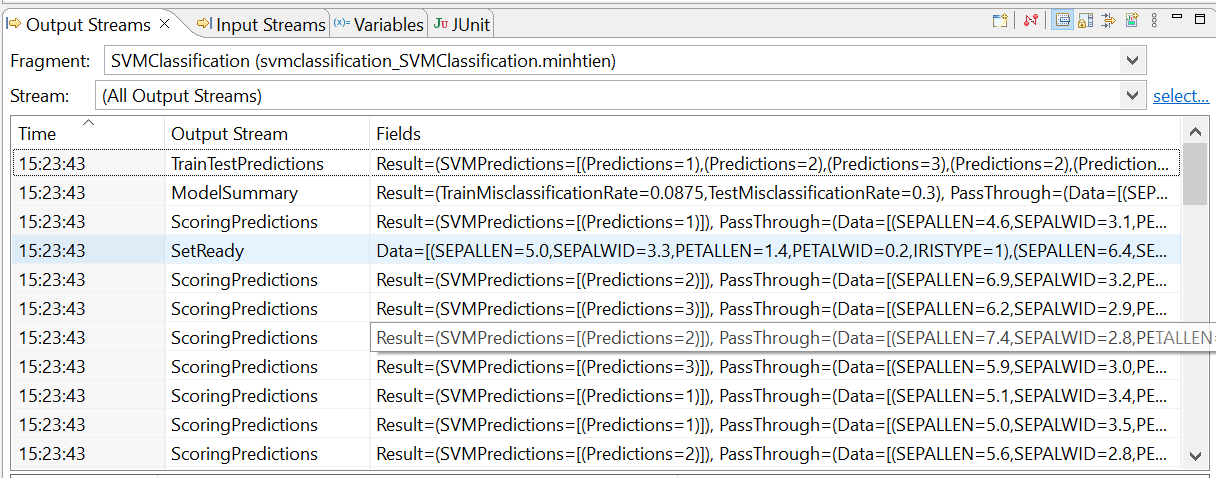 The Support Vector Machine Classifier operator starts taking data from the feed simulation and emitting the results after 100 rows are collected.