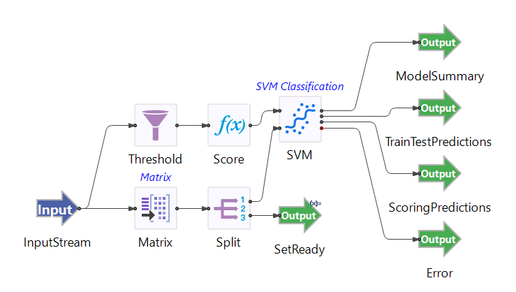 The provided StreamBase modules for these operators use the IRIS Flower data - irisdat.csv. SEPALLEN, SEPALLWID, PETALLEN, PETALWID features are selected as predictors. IRISTYPE is selected as the response. Data is fed into the Matrix operator to be collected and emitted every 100 rows. Once the matrix operator has collected the required number of rows of data, the SetReady output stream sets a dynamic variable indicating the Threshold condition has been met. The first N tuples are not scored because the operator is yet to be trained. This operator uses the collected data and options (from the provided schema) as inputs.