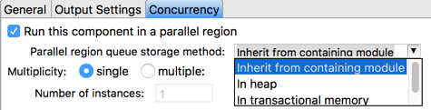 Most operators can be configured to run in a parallel region using the Concurrency tab of their Properties views. Parallel regions have automatic queues for both incoming and outgoing tuples. You can specify the storage method for these queues in the same tab.
