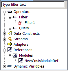 Expand and collapse categories (such as Operators, Data Constructs, and Streams) to display their components, by clicking the arrow buttons on their left side. To collapse all categories, click the