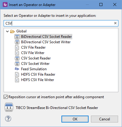 The Reposition cursor at insertion point option is selected by default. This allows you to immediately click to select the newly dropped adapter and show its Properties view. If you are adding several adapters with different search strings, unselect this option so that the cursor remains in the dialog.