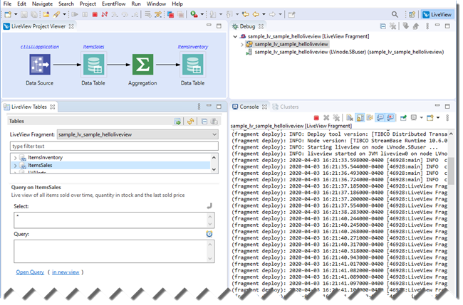 Bottom Left: LiveView Tables view: In this view, a drop-down list shows the available (running) LiveView fragments and connects to the server when you select a fragment. Once a fragment is running, its tables are displayed below.