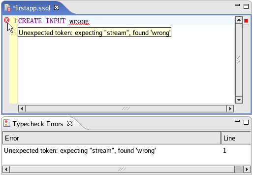 When the StreamSQL Editor opens, you can begin typing in it just as you would with any text editor. The following screen shows the editor after a line of code is entered. Note that the line is the beginning of a StreamSQL statement, and it includes a deliberate syntax error: