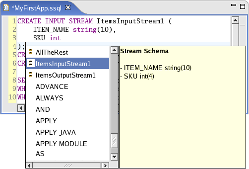 In the next screen, we have finished entering the schema for the first input stream, and then defined two output streams. Now when we press Ctrl+Shift+Space, the top of the Content Assist list provides the names of the streams, and in the secondary window, their schema fields. This makes it easy to insert these names and valued anywhere you need to reference them: