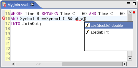 Displays a list of StreamSQL keywords and StreamBase functions that you can insert at the cursor. Note that the items in the list may vary depending on your context. Also, StreamSQL cannot help you choose among valid items: that depends on your module's functionality.